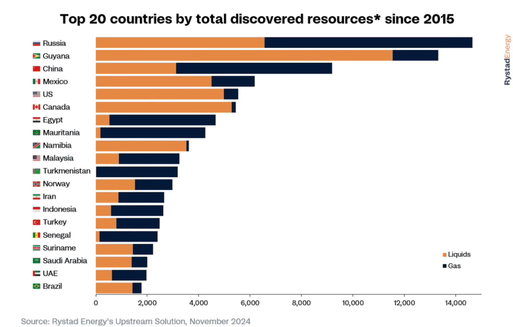 The scale of this transformation becomes clearer when placed in global context. Since 2015, Guyana ranks among the top countries worldwide in total discovered hydrocarbon resources, second only to Russia in liquids discoveries. For a country of fewer than one million people, this positions Guyana not as a marginal producer, but as one of the most significant new petroleum provinces of the past decade.